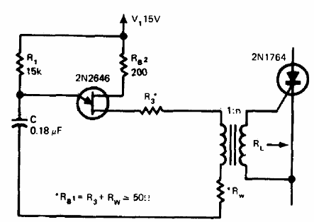 En la figura mostramos un circuito disparador para triacs con un transistor unijunción. El circuito es de una publicación antigua. El transformador de pulsos tiene una relación de espiras que depende del triac usado. Los triacs de la serie TIC se pueden emplear en este circuito. Dependiendo de la carga, el SCR debe estar dotado de radiador de calor.