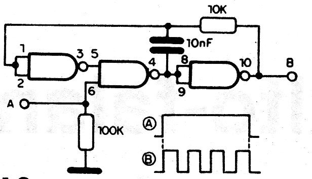 En un proyecto de microprocesador (shield) para aplicaciones de control, un reloj disparado puede tener utilidad. El disparador permite inicializar la operación en el momento adecuado y detenerla también en el momento oportuno. El circuito presentado en la figura trabaja en frecuencia relativamente baja, del orden de algunos quilohertz, pero la disminución del condensador puede elevar esta operación hasta algunos megahercios, que es el límite del 4011. En la salida tenemos las formas de onda correspondientes, observándose que la aplicación del nivel alto es quien da la salida al oscilador.