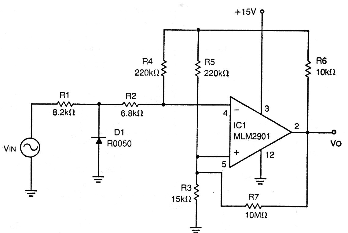 Este "detector de paso por cero" detecta cuando una señal pasa por el punto de cero volt produciendo un pulso de salida. Este tipo de circuito es muy usado en controles de potencia. El circuito es de una documentación de los años 70, utilizando un funcionamiento que no es fácil de obtener. Se pueden utilizar operacionales equivalentes como, por ejemplo, el 741. La alimentación se puede cambiar en función del funcionamiento utilizado. La resistencia R1 depende de la intensidad de la señal de entrada.