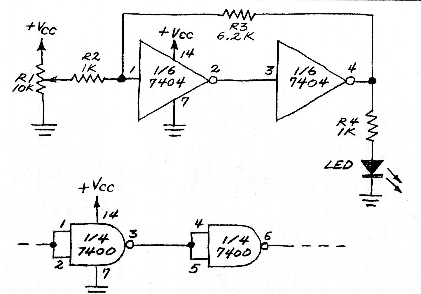 Con este circuito podemos demostrar el funcionamiento de un disparador de Schmitt usando lógica TTL. El circuito es de una publicación americana de los años 80 debiendo ser alimentado con 5 V. Podemos usar tanto el 7404 como el 7400 configurado como inversor, mostrado en la misma figura.