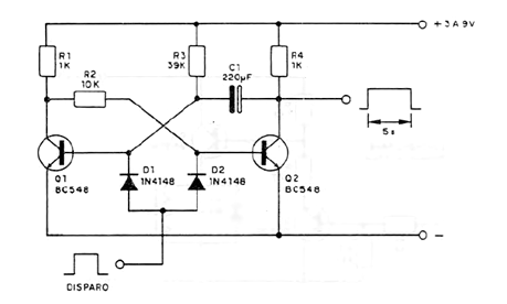 Un pulso aplicado a este circuito hace que conmute y permanezca en el nuevo estado por un tiempo determinado por R3 y C1. Ver en el sitio fórmulas para monoestables. El circuito puede ser alimentado por tensiones de 3 a 9 V y el clock debe ser positivo.