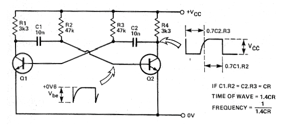 Este circuito fue encontrado en el Electronics Digest de 1984. Se trata de la versión tradicional del multivibrador astable con transistores que el internauta puede encontrar en diversos puntos de este sitio. El circuito oscila en una frecuencia que depende de los resistores R2 y R3 y de los capacitores, según fórmula dada junto al diagrama. El circuito funcionará con tensiones de 3 a 12 V y los transistores pueden ser de cualquier tipo de uso general como los BC547, BC548, BC549, BC549, 2N2222, etc. Observe las formas de onda de las señales en los puntos principales del circuito.