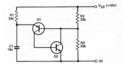 Este circuito fue encontrado en una publicación inglesa de 1984. El autor lo llama de Astable Serial pero preferimos denominarlo unijuntura con Transistores Bipolares, como ya hicimos en otros artículos del sitio. Se trata de un circuito que simula un transistor unijuntura en un oscilador de relajación cuya frecuencia depende de R1 y C1. Q1 puede ser un BC558 y Q2 un BC548. El circuito funcionará con tensiones de 9 V a 12 V normalmente. Un resistor de 10 ohmios a 100 ohmios en el emisor de Q2 sirve de carga para el circuito para la retirada de los pulsos generados para un circuito externo.