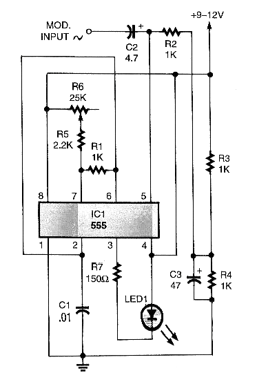 En la figura siguiente tenemos un circuito sugerido por un Poptronics del año 2000. La revista ya no existe pero el circuito es actual y muy importante. En él se muestra cómo es posible modular la señal de un 555 cuya frecuencia depende de C1, R1 y se ajusta en R6.De cierto, este R6 puede tener valores hasta 100 k ohms y C1 cambiado en una amplia gama de valores. El circuito también funcionará con tensiones a partir de 5 V. Podemos utilizar este circuito en un enlace de audio haciendo el circuito oscilar en alta frecuencia y desmodulando en un NE567.