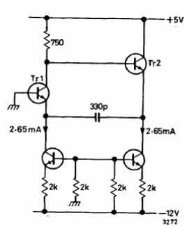 Encontramos este circuito en el manual de aplicaciones de Ferranti de 1974. Ferranti ahora es Zetex, pero el circuito puede ser implementado con transistores comunes como el BC548. La frecuencia medida es de 1,09 kHz.