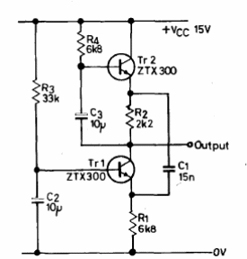 Esta configuración, que genera una señal de 9 kHz, fue encontrada en un manual de aplicaciones de transistores de Ferranti de 1974. Los condensadores pueden ser alterados para generar señales de otras frecuencias y los transistores pueden ser equivalentes como los BC548.