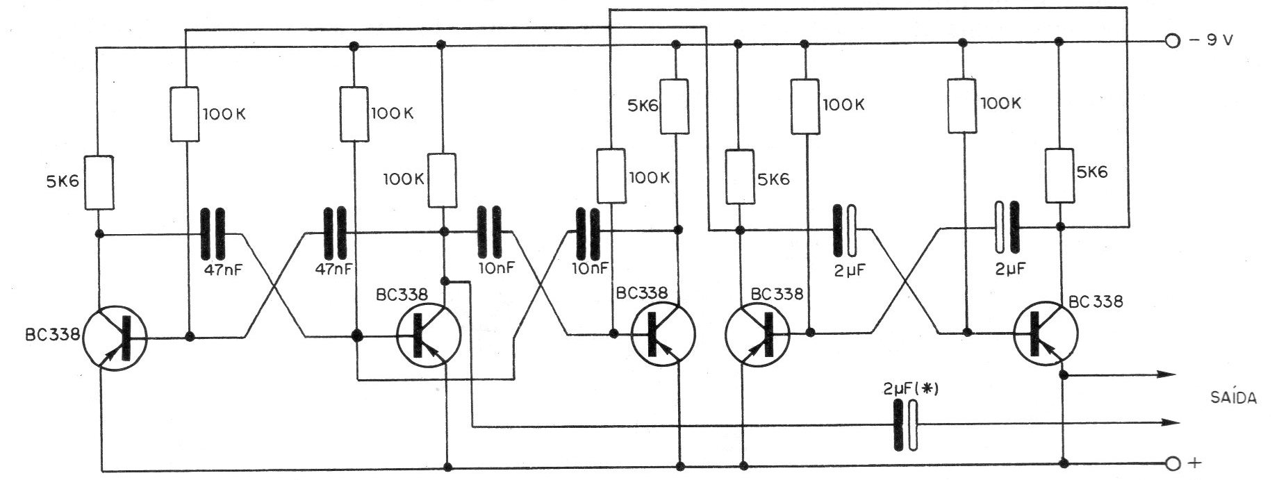 ¿Para qué sirve un generador de doble frecuencia? Diversas son las posibilidades de uso para este circuito. El lector puede emplearlo como parte de un buscador de señales diferente, como parte de un instrumento musical electrónico o, simplemente, para generar una señal de timbre diferente en una alarma. Evidentemente, en estas aplicaciones en que el nivel de señal necesario es más alto, será necesario utilizar un amplificador de potencia, externamente. El circuito de este generador de doble frecuencia se muestra en la figura. Conforme el lector puede percibir, se utilizan dos multivibradores astables interconectados, con la utilización de un tercer transistor interacoplado para obtener un efecto de sonido diferente. Los capacitores de 47 nF, 10 nF y 2uF determinan las frecuencias de las señales que están alrededor de 150 Hz la primera y 750 Hz la segunda. El lector utilizó, en el proyecto original, transistores de germanio OC71, pero equivalentes modernos, como el Bo338, pueden perfectamente llevar a los mismos resultados prácticos. En realidad, incluso los transistores NPN de uso general, como los BC237, BC238, BC547 o BC548, pueden ser utilizados, siempre y cuando se invierte la polaridad de la fuente de alimentación. La salida del circuito es de alta impedancia, debiendo ser llevada a circuitos amplificadores con la ayuda de cable blindado. El capacitor de acoplamiento de salida de 2 uF, marcado con (*), puede ser cambiado para adaptar las características del circuito a la entrada del amplificador. En el montaje, que puede ser hecho en puente de terminales o placa de circuito impreso, los principales cuidados a ser tomados son los ya conocidos de la mayoría de los montadores. Los resistores pueden ser de 1/8 o ¼ W, con 10 o 20% de tolerancia. Los capacitores pequeños pueden ser de cerámica o poliéster, con tensiones de trabajo superiores a 25 V. Los capacitores electrolíticos son de 2 uF, 2,2 uF o aún de valores cercanos, si el lector desea experimentar efectos diferentes. En su instalación debe observarse su polaridad. La tensión de alimentación de 9 V puede venir de 6 pilas pequeñas comunes, ya que el consumo de la unidad es bajo, de una sola batería o de una fuente. Observamos que el ritmo de la variación de frecuencia de los dos signos producidos por este generador, puede ser modificado por el cambio de los capacitores electrolíticos de 2,2 uF o 2 uF. Los dos capacitores no necesitan tener exactamente los mismos valores.