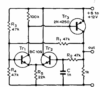 Este circuito es de una documentación de 1975, pero puede ser implementado con transistores más modernos como los BC549 en lugar de los BC109 y BC558 en lugar del 2N4250. El circuito puede ser alertado con el cambio del ciclo activo y del capacitor C.