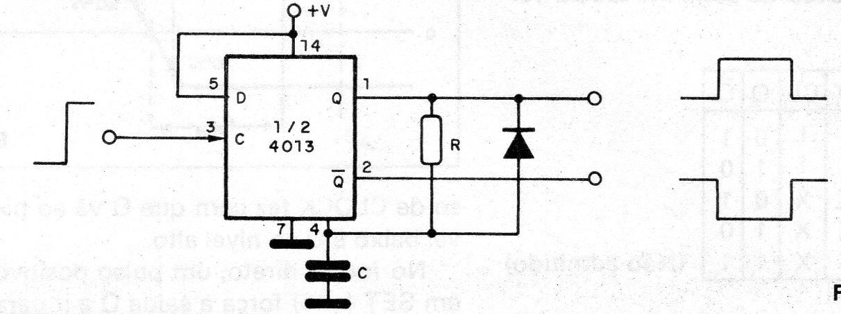 Damos ahora una aplicación diferente del 4013 que también se puede utilizar como monoestable. En los monoestables comunes existe una retroalimentación interna que determina el final del pulso cuando entonces ocurre la conmutación La conexión de la salida Q a una resistencia que carga un condensador C permite que se retarde el Reset hasta el punto deseado, obteniéndose entonces una acción monoestable.