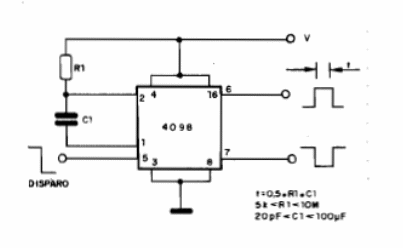Los tiempos de las señales de salida en función de R1 y C1 son dados por las fórmulas junto al diagrama. Este circuito se dispara en la transición negativa de la señal de entrada y puede ser alimentado por tensiones entre 3 y 12 V típicamente. Las salidas son complementarias con el mismo tiempo de duración. El circuito puede ser utilizado como Shield de entrada para microcontroladores, evitando el problema de repiques de sensores o llaves.