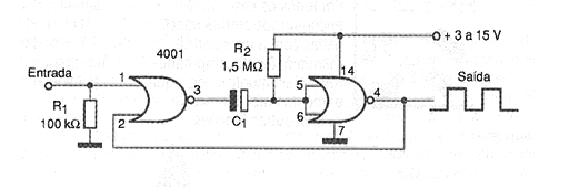 En la figura mostramos un monoestable que utiliza dos de las cuatro puertas disponibles en el 4001. La duración del pulso generado en la salida cuando se aplica un pulso de corta duración en la entrada depende del valor del capacitor C. Este componente puede tener valores en el rango de 1 nF a 100 uF.