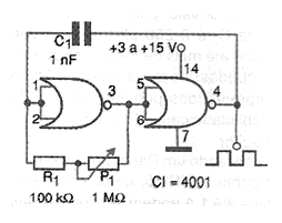 Un oscilador cuya frecuencia puede ajustarse entre 500 Hz y 5 kHz con el uso de un potenciómetro, se muestra en la figura. Otras bandas de frecuencia se pueden obtener con el cambio del capacitor C1. Los valores mayores implican en frecuencias más bajas. La señal producida por este oscilador es rectangular con amplitud igual a la de la tensión de la fuente de alimentación.