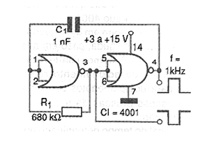 El circuito mostrado en la figura genera una señal rectangular cuya frecuencia depende de C1. Para un condensador de 1 nF la frecuencia generada será del orden de 1 kHz mantenidos los demás valores de los componentes del diagrama. Recordamos que la frecuencia máxima recomendada para este circuito con una alimentación de 10 V está en torno a 7 MHz. Vea que podemos obtener salidas en oposición de fase, retirando las señales de las salidas de las dos puertas.