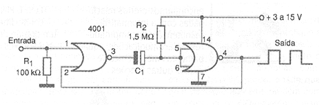 En la figura mostramos un monoestable que utiliza dos de las cuatro puertas disponibles en el 4001. La duración del pulso generado en la salida cuando se aplica un pulso de corta duración en la entrada depende del valor del capacitor C. Este componente puede tener valores en el rango de 1 nF a 100 uF. La alimentación se puede hacer con tensiones de 3 a 15 V y la señal de salida es rectangular.