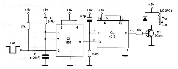 La activación de un relé a partir de pulsos (procedentes de un monoestable, por ejemplo) puede ser útil en diversos tipos de control. En la figura damos una configuración que usamos con frecuencia en nuestros proyectos por su funcionalidad y simplicidad. A cada pulso producido por el 555 que se obtiene de un sensor de entrada, el flip-flop cambia de estado y, consecuentemente, el relé también. El tiempo de duración del pulso de salida del monoestable (555) se calcula de modo que se evita la activación del sensor por más de un instante produciendo diversos pulsos de salida y con ello el accionamiento errático del circuito.