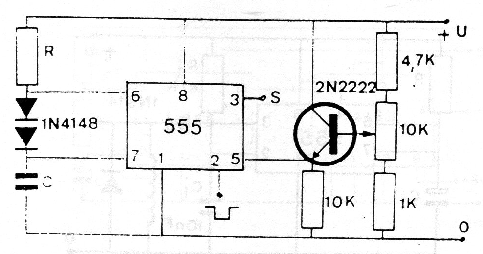 Se muestra una configuración en la que tenemos una tensión de control aplicada a partir de un divisor de tensión, la cual determina el punto de disparo del 555, Así, otros valores diferentes de 2/3 Vcc pueden ser programados para el disparo. El tiempo es dado por RC. La alimentación puede oscilar entre 5 y 15 V. El circuito se puede utilizar como shield.