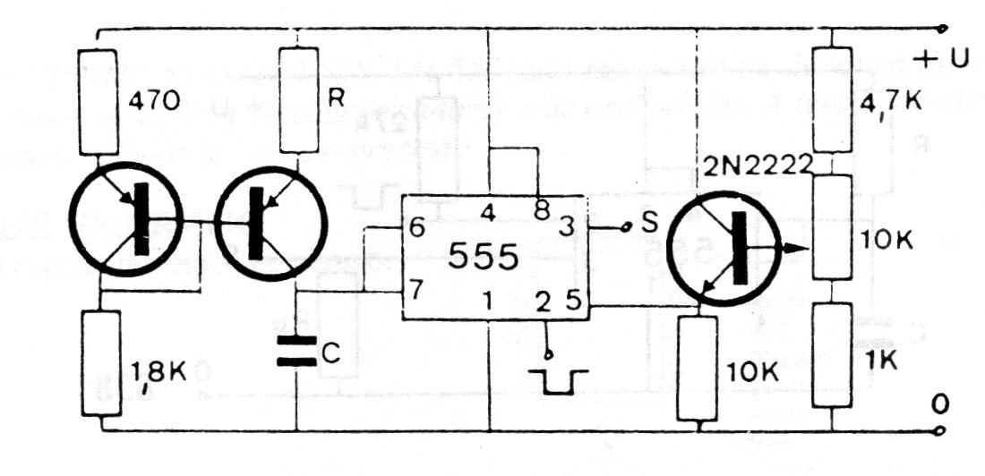 Este circuito es una variación del anterior (CIR4322S) con un recurso que permite la carga constante del condensador. De esta forma la tensión en C sube linealmente durante el proceso de carga en la operación monoestable. La tensión puede oscilar entre 5 y 15 V. Como l anterior, se puede utilizar como shield.