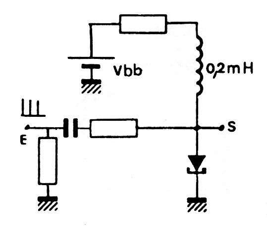Este circuito monoestable tiene su tiempo determinado por el condensador. La tensión de alimentación es del orden de 1,5 V y el circuito puede generar señales de duración extremadamente corta.