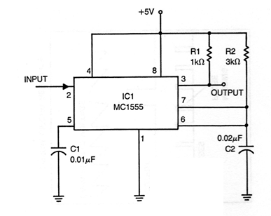 Esta configuración tradicional de monoestable es de una documentación de Motterola de los años 70. El circuito integrado es la versión Motorola de la época, pudiendo ser sustituida por el convencional 555 actual. El circuito puede ser alimentado por tensiones de 5 a 15 V y la entrada de disparo es hecha por la transición negativa de la señal. No es conveniente dejar esta entrada de disparo abierta. Se recomienda un resistor pull-up de 1k a 100k. El tiempo de la señal de salida es dado por la constante de tiempo R2 / C2.