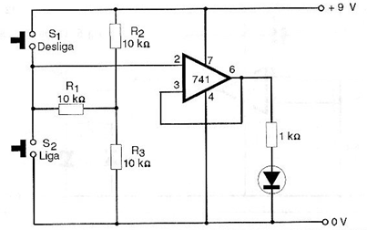Este circuito no necesita una fuente simétrica. Esto permite que la alimentación sea hecha con una tensión más baja que la mostrada en el CIR4021. En la figura tenemos la configuración que acciona también un LED indicador. Para obtener la tensión de referencia igual a la mitad de la tensión de alimentación se utiliza un divisor con los resistores R2 y R3. Los valores de estos resistores no son críticos y siempre que sean iguales pueden quedar en el rango de 10k a 47 k ohms típicamente. También en este caso es posible utilizar una etapa excitadora con un transistor para controlar cargas de mayor potencia, como por ejemplo un relé.