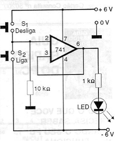 La segunda configuración que mostramos es un flip-flop que se puede disparar a través de dos interruptores de presión del tipo normalmente abierto. Uno de los interruptores enciende el LED estableciendo el flip-flop mientras que el otro apaga el LED restableciendo el circuito. Se trata, pues, de un flip-flop del tipo R-S. Este circuito debe ser alimentado por una fuente de alimentación simétrica a partir de 6 voltios como muestra la figura 1. Evidentemente, en lugar del LED podemos utilizar un paso transistorizado con un relé como carga para poder controlar cargas mayores. Un controlador con el transistor BC548 o equivalente se puede utilizar para este propósito.