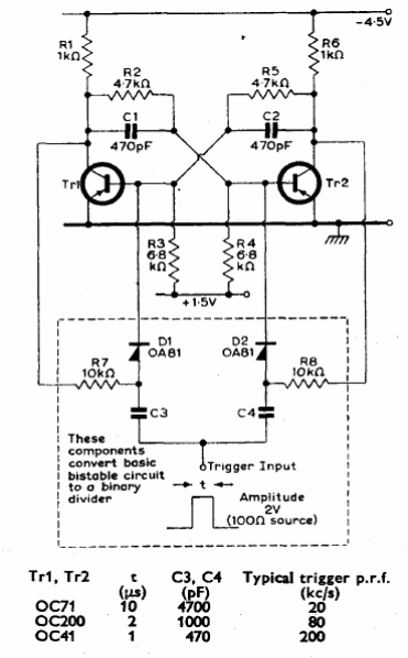 Encontramos este circuito en el manual de transistores de la Mullard de1960. El circuito puede ser elaborado con transistores más modernos y pequeños cambios de los resistores.