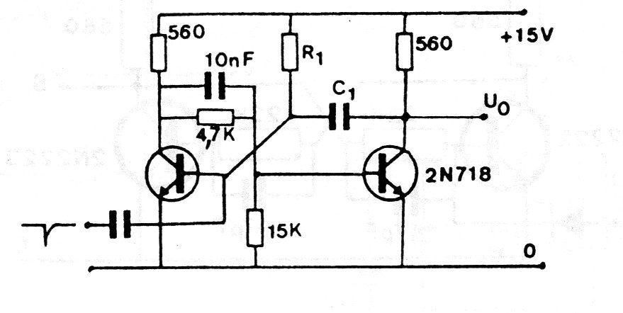 Este circuito se dispara con pulsos negativos y el valor de C depende de su intensidad. C1 determina la duración del pulso de salida. Los transistores pueden ser los 2N2222 o 2N2218 e incluso otros de uso general. Dependiendo del transistor, la alimentación se puede hacer con tensiones menores.