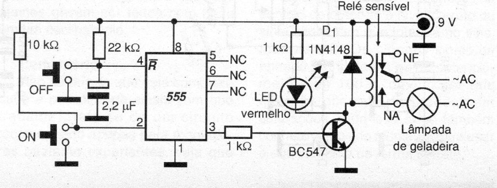 Este circuito permite accionar un relé de forma biestable usando un 555. Los interruptores de presión arman y desarman el relé; El circuito puede ser alimentado por tensiones de 6 a 12 V según la tensión de la bobina del relé utilizado.