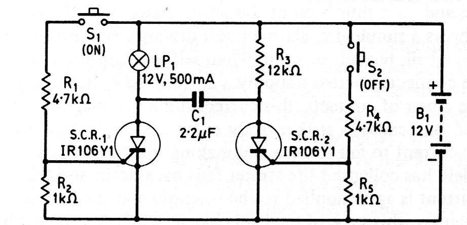 Esta configuración que exploramos en diversos circuitos prácticos de nuestro sitio fue obtenida en una documentación de los años 70. El circuito muestra cómo podemos conectar y desconectar un circuito con SCRs usando dos interruptores de presión que también pueden ser sensores o incluso reed relés en una aplicación como shield.