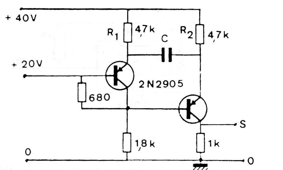 Este multivibrador asequible tiene un acoplamiento por emisor entre los transistores. El circuito es de una documentación de los años 80 y los transistores pueden ser los BC548. El período puede calcularse por T = 0,69RC. La alimentación debe ser hecha por dos tensiones, algo elevadas para este tipo de circuito.