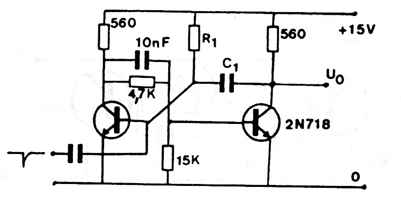 Los transistores equivalentes, como los BC548, se pueden utilizar en este circuito que encontramos en una documentación de los años 80. Los tiempos de salida son dados por el condensador C1. El capacitor de entrada depende de las características del reloj, pudiendo asumir valores entre 10 nF y 470 nF típicamente.