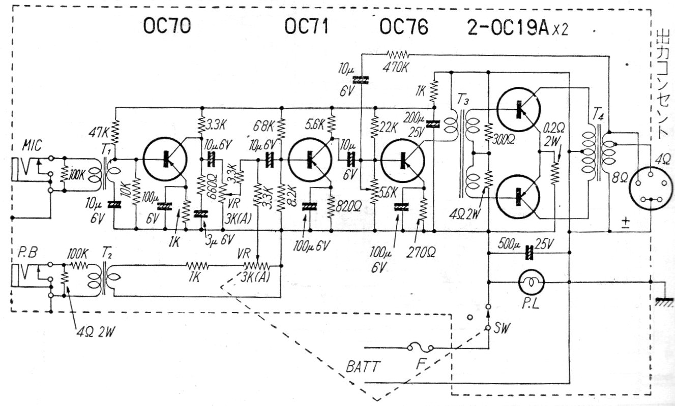 Este amplificador comercial utiliza transistores de germanio de la época. Se encontró en una publicación japonesa de los años 60 y se alimentó con una batería de corriente de al menos 2 A. El circuito tiene entrada para micrófono y otra fuente de señal, como un tocadiscos.