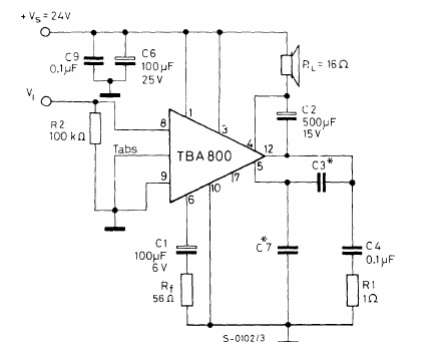 Este circuito tiene la carga conectada al positivo de la fuente proporcionando 5 W de potencia en 16 ohms. El circuito es del manual de circuitos integrados lineales de la SGS. Los capacitores C3 y C7 tienen valores entre 10 y 100 nF típicamente.
