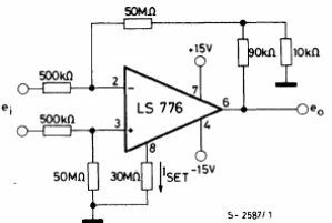Encontramos este circuito con ganancia de tensión de 100 veces en el manual de circuitos integrados lineales de la SGS de 1982. El circuito integrado usado no es común actualmente, pero la configuración es válida para operativos equivalentes más modernos. La fuente de alimentación debe ser simétrica.