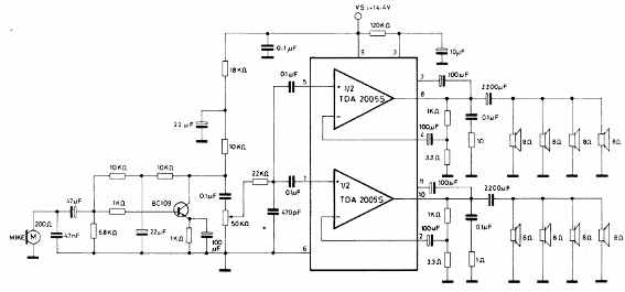 Este amplificador tiene su uso recomendado para ser instalados en bus para ser utilizado con un micrófono, por ejemplo, en bus de turismo. El circuito es del manual de circuitos integrados lineales de la SGS y en la configuración se utilizan 8 altavoces de 8 ohms.