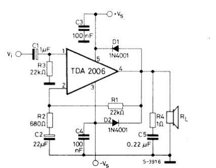 La fuente de alimentación de este circuito debe ser simétrica de 15 + 15 V y la carga de 4 ó 8 ohms. El circuito es del manual de circuitos integrados lineales de la SGS de 1982.
