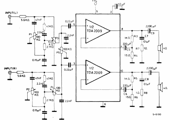 Además del control de tono, este circuito del manual de circuitos integrados lineales de la SGS de 1982, tiene un control de audibilidad (loudness). La alimentación debe realizarse con tensión de 24 V.