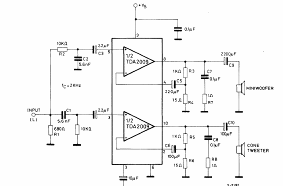 Este amplificador (indicado para TV por el fabricante) tiene un canal de medios y graves y otro de agudos con filtro separador. El circuito debe ser alimentado por tensiones hasta 24 V y dotado de un buen radiador de calor. Encontramos esta configuración en el manual de circuitos integrados lineales de la SGS.