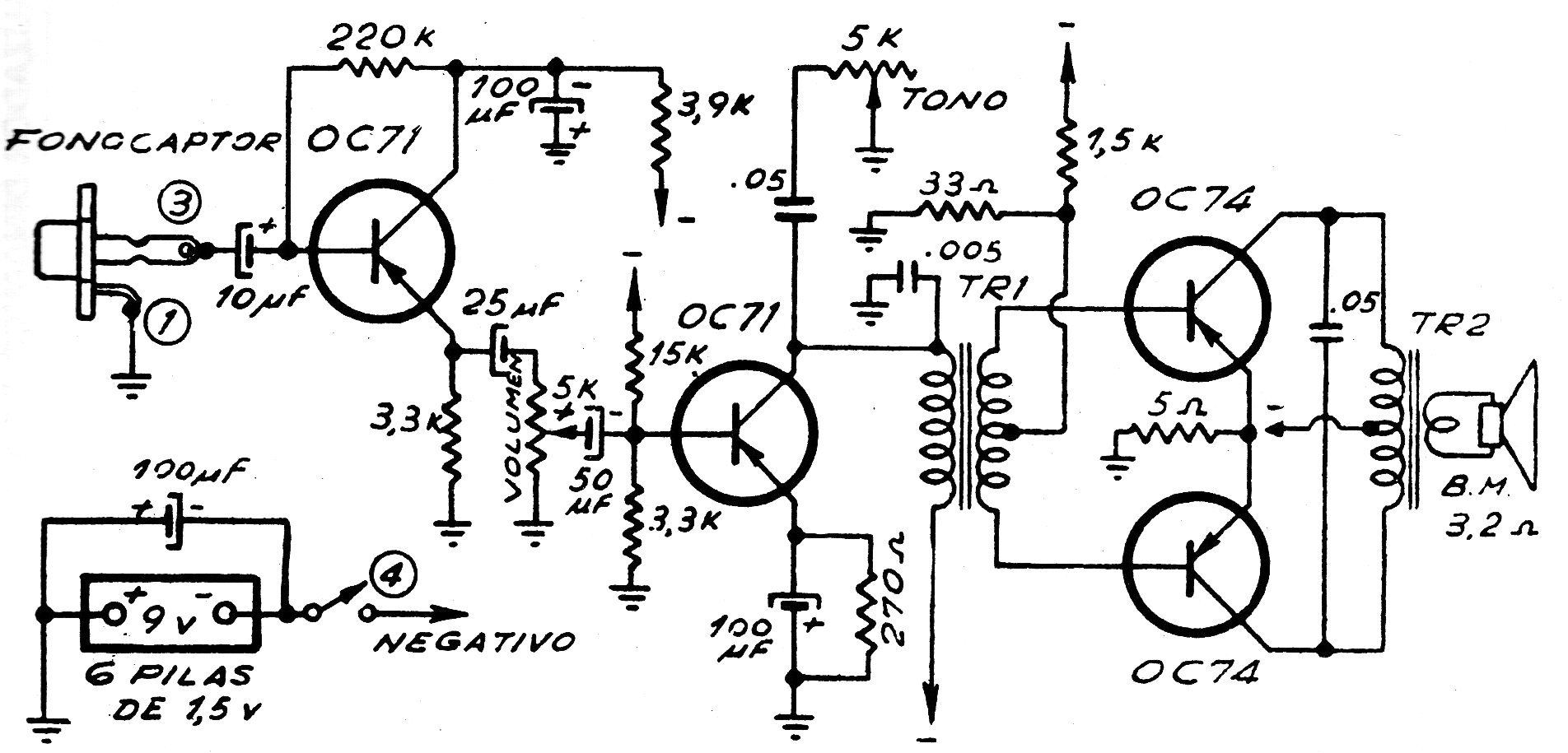 Este es el circuito típico de un amplificador de fracción de vatio para un pequeño tocadiscos o electrola portátil de los años 70. El circuito utiliza transistores de germanio en la salida y dos transformadores en una etapa push-pull clase B. Vale el circuito para la recuperación de equipos. La entrada es de alta impedancia para cápsulas de cristal o cerámica. El circuito funciona con 6 pilas grandes y tiene un buen consumo. En la recuperación, utilice una fuente de 9 V con corriente de al menos 1 A, pues hay el pequeño motor del tocadiscos para alimentar.