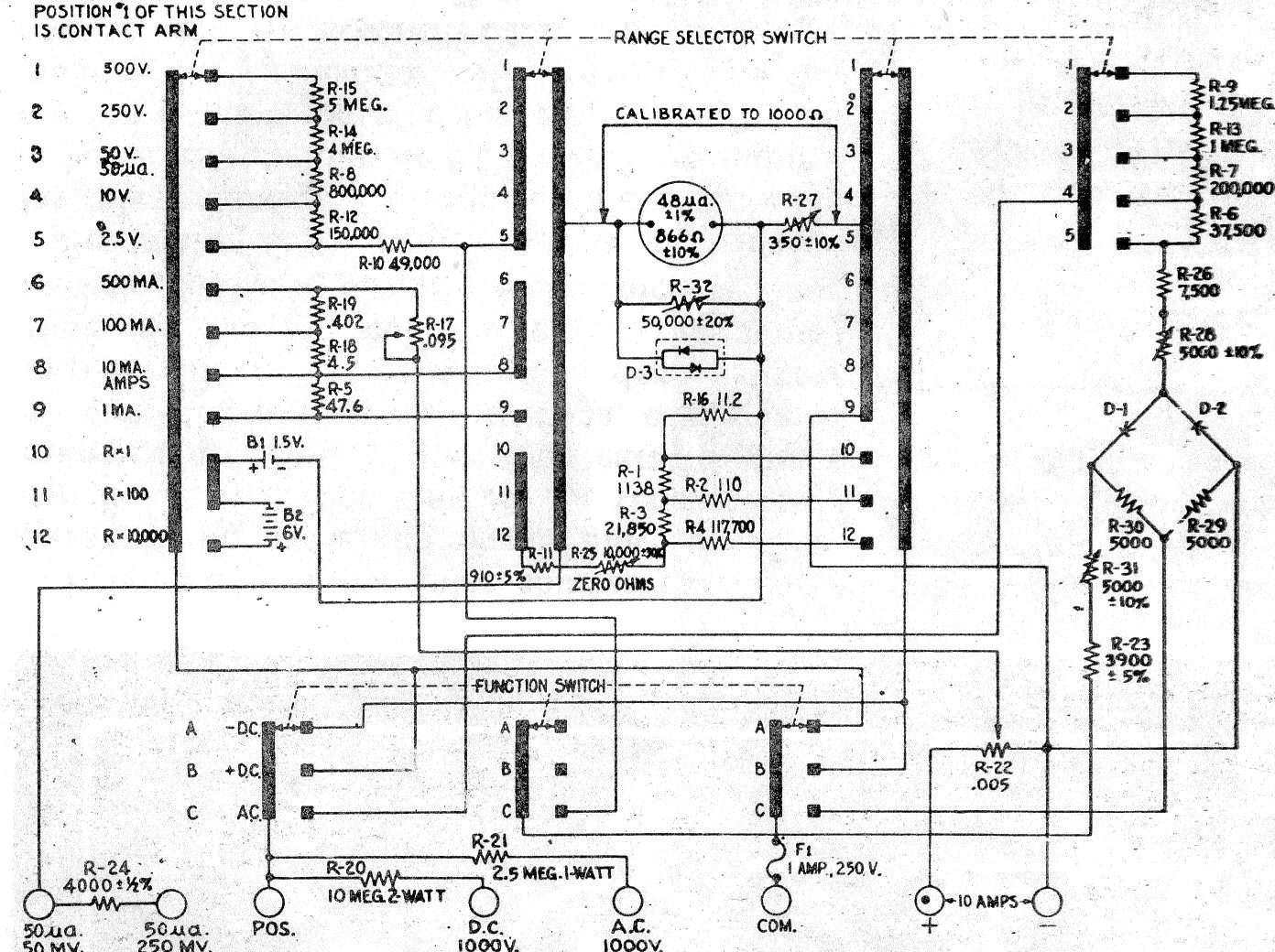 Este fue un instrumento muy popular en los talleres de los años 60 y 70. Era un "top de línea" para los técnicos que hacían reparaciones e instalaciones electrónicas. Si usted encuentra uno en una chatarra con algún tipo de problema necesitará su diagrama para referencia, tratando de comprobar la posibilidad de recuperación. El diagrama complejo de este multímetro se da a continuación, recordando que los componentes son de precisión.