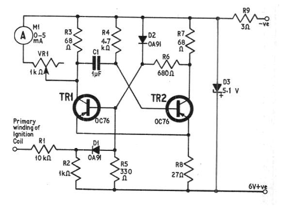 Este circuito, que hace uso de transistores de germanio, es de una revista inglesa de 1965. Los transistores usados son muy difíciles de obtener, pero el circuito puede ser adaptado para usar transistores PNP de silicio como los BC558. El instrumento también puede ser de 1 mA con aumento de VR1 a 10k ohmios. Los diodos son de germanio. Los componentes se pueden cambiar para una operación de 12 V.