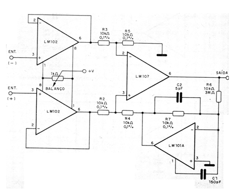 Este amplificador de altísima resistencia de entrada ha gaño variable y debe ser alimentado por una fuente simétrica. El circuito cuenta con un control de balance y otros amplificadores operativos pueden ser utilizados. Los resistores de precisión son para garantizar la simetría de las señales.