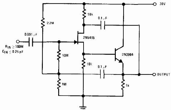 Este circuito fue sugerido por el FET Databook de National Semiconductor. Los transistores admiten equivalentes. La impedancia de entrada es extremadamente alta y la ganancia de tensión es unitaria con una impedancia de salida muy baja.