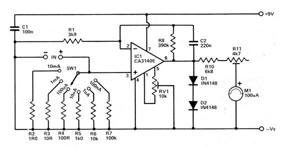 La precisión de este circuito depende de las resistencias conectadas a la red selectora de pistas. El instrumento puede ser un multímetro común en su escala más baja de corrientes. La alimentación se realiza por batería y el consumo muy bajo. Encontramos este circuito en una documentación de 1979.