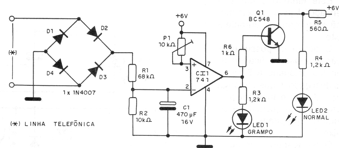 Este circuito de una documentación de 1995 detecta cuando una extensión en una línea telefónica está activa. El ajuste del punto de funcionamiento se realiza en un trimpot. La indicación se realiza por LED. La alimentación viene de una fuente de 6 V o de las pilas.