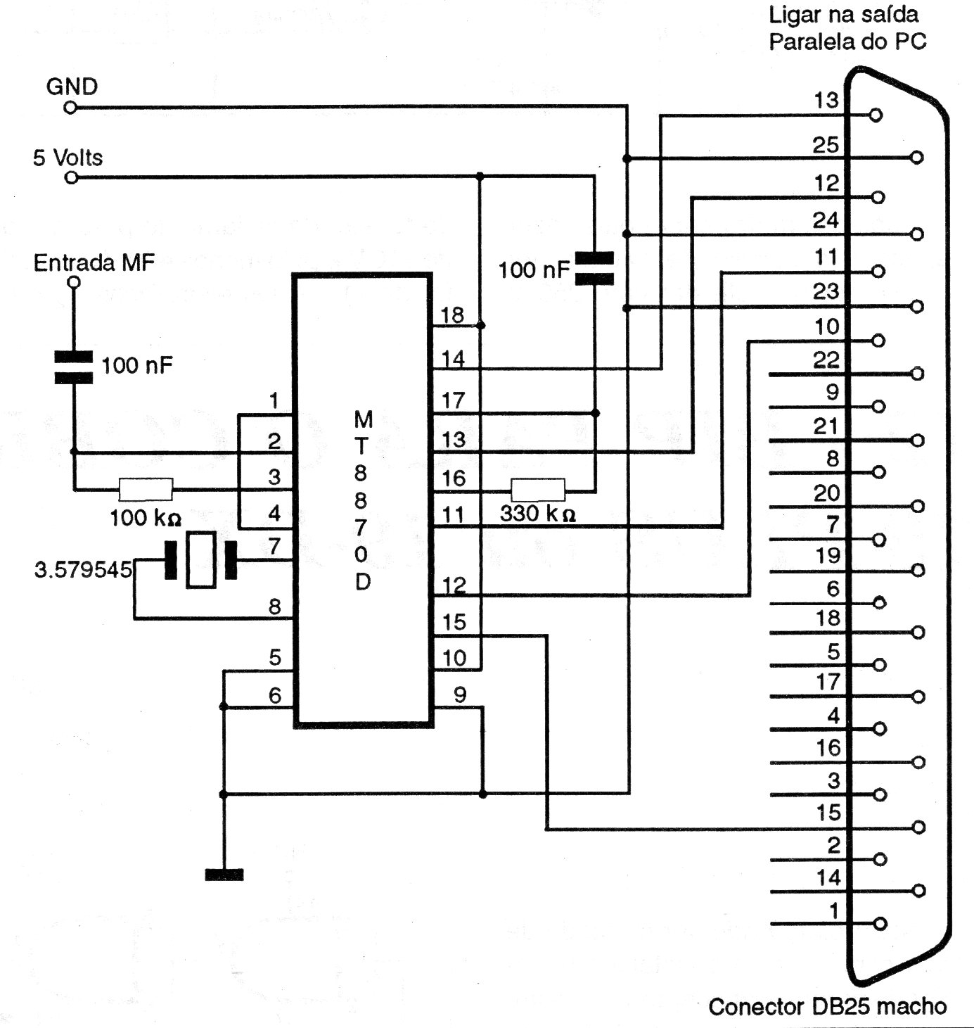 Este circuito, que se encuentra en una documentación de 1997, tiene por objeto reconocer tonos de marcación telefónica. Si el lector tiene un ordenador antiguo con entrada paralela y desea utilizarlo en una automatización o control vía línea telefónica, este circuito puede ser de utilidad. Con modificaciones se puede utilizar con microcontroladores modernos.