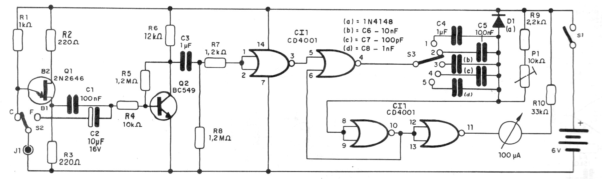 Encontramos este circuito en una publicación de 1994. Utiliza componentes comunes y puede medir frecuencias de 0 a 1 MHz y capacitancias de 1 nF a 1 uF todo en 5 pistas. El circuito utiliza un microamperímetro común o la escala correspondiente de corrientes de un multímetro común. El circuito es alimentado por 4 pilas y la precisión depende de los capacitores usados como referencia y del ajuste de P1. Se puede utilizar la frecuencia de la red de 60 Hz para la calibración.