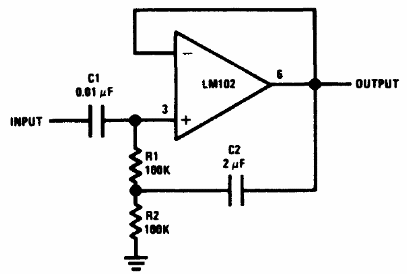 El circuito mostrado fue encontrado en el Linear Application Handbook de National Semiconductor de 1994. El amplificador operacional admite equivalentes y la fuente de alimentación debe ser simétrica.
