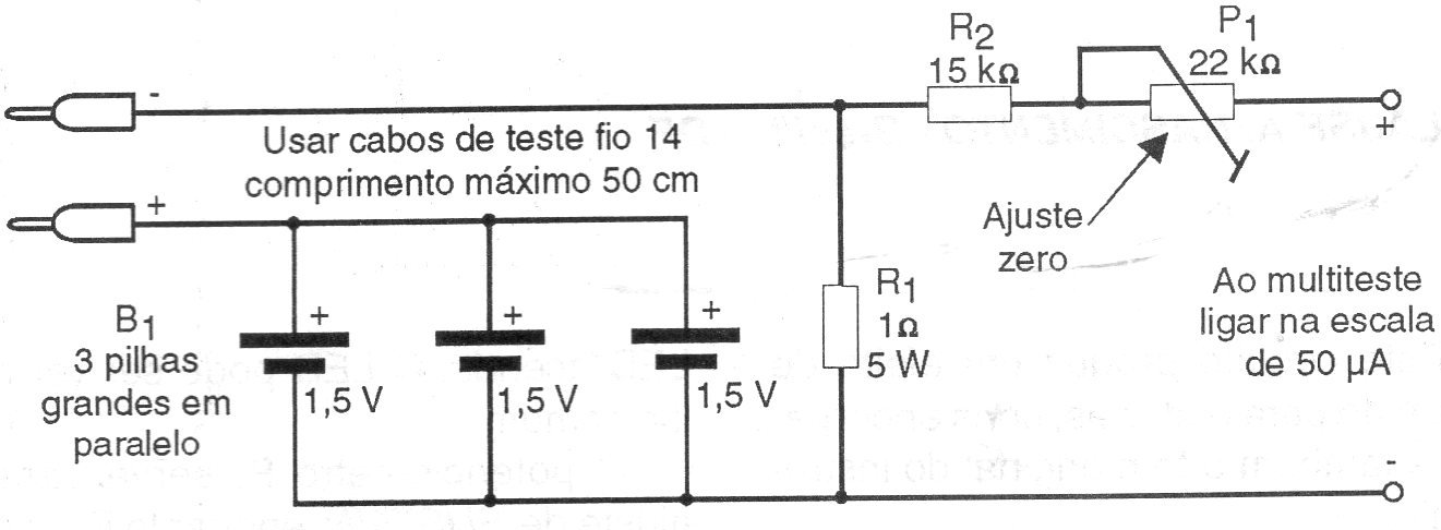 La finalidad de este circuito es permitir que los multímetros analógicos comunes midan resistencias bajas, del orden de 0,1 ohms con buena precisión. El circuito mide la caída de tensión en R1 que debe ser tolerancia baja, utilizando una escala de corrientes baja del multímetro. Así, con este circuito, una corriente de 0,15 uA equivale a una resistencia de 1,5 ohms.