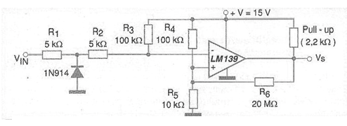 En muchas aplicaciones que involucran el control de circuitos desde la red de energía el detector de paso por cero es un elemento fundamental. Esto ocurre en el caso de los controles de potencia por ángulo de fase que hacen uso de TRIAC y otros tiristores o dispositivos de potencia. Un detector de paso por cero o zero crossing detector no es más que un circuito que produce un pulso de salida cuando una tensión alternada aplicada a su entrada pasa por el punto de cero volt. El circuito, que hace uso de sólo un comparador de tensión, se muestra en la figura. La señal de salida de este circuito es una onda cuadrada que corresponde al signo senoidal aplicado a la entrada. Esto significa que también se puede utilizar para hacer rectangular una señal sinusoidal. La histéresis del circuito es muy baja, menor de 10 mV y la fuente de alimentación no necesita ser simétrica.